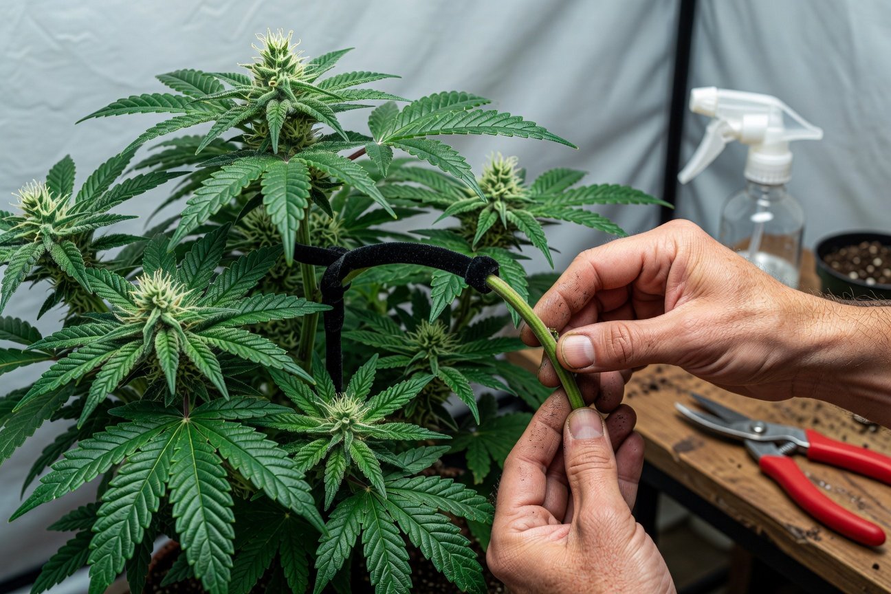Gently bend and tie main stems horizontally from week 2 to create an even canopy. Avoid high-stress techniques like topping, which can delay recovery.